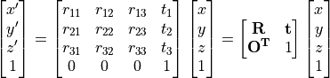 剛体変換は、同次座標系を用いて、以下のように記述できる.